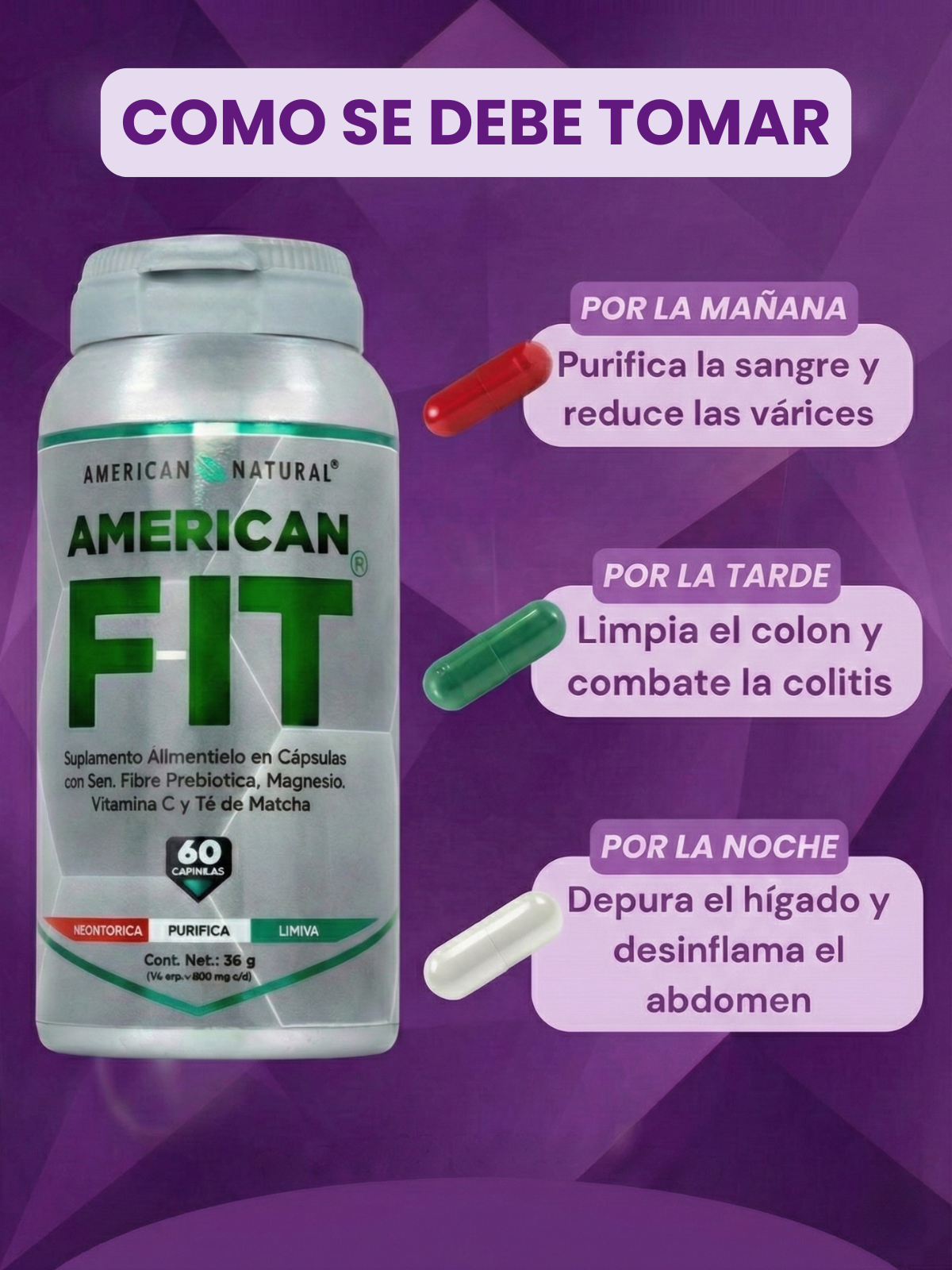 Toma 3 cápsulas al día con agua y tus comidas: 1 roja en la mañana, 1 verde en la tarde y 1 blanca en la noche. Mantén buena hidratación y sigue el tratamiento durante 60 días para potenciar los resultados.